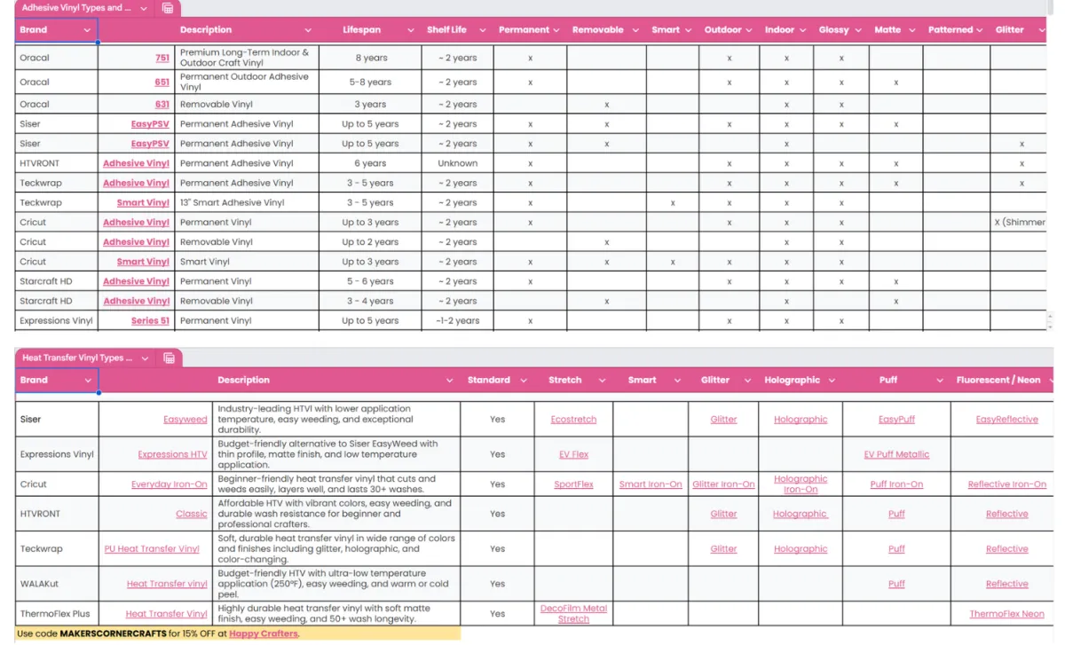 Get access to the expanded online Adhesive Vinyl Reference Guide and the HTV Reference Guide.